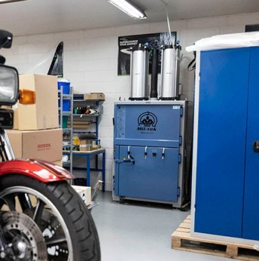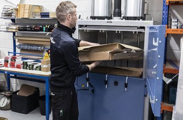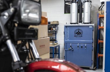 Skjern Motorcycles oszczędza miejsce i utrzymuje porządek w warsztacie dzięki szybkiej, pneumatycznej belownicy do kartonu Mil-tek A406.